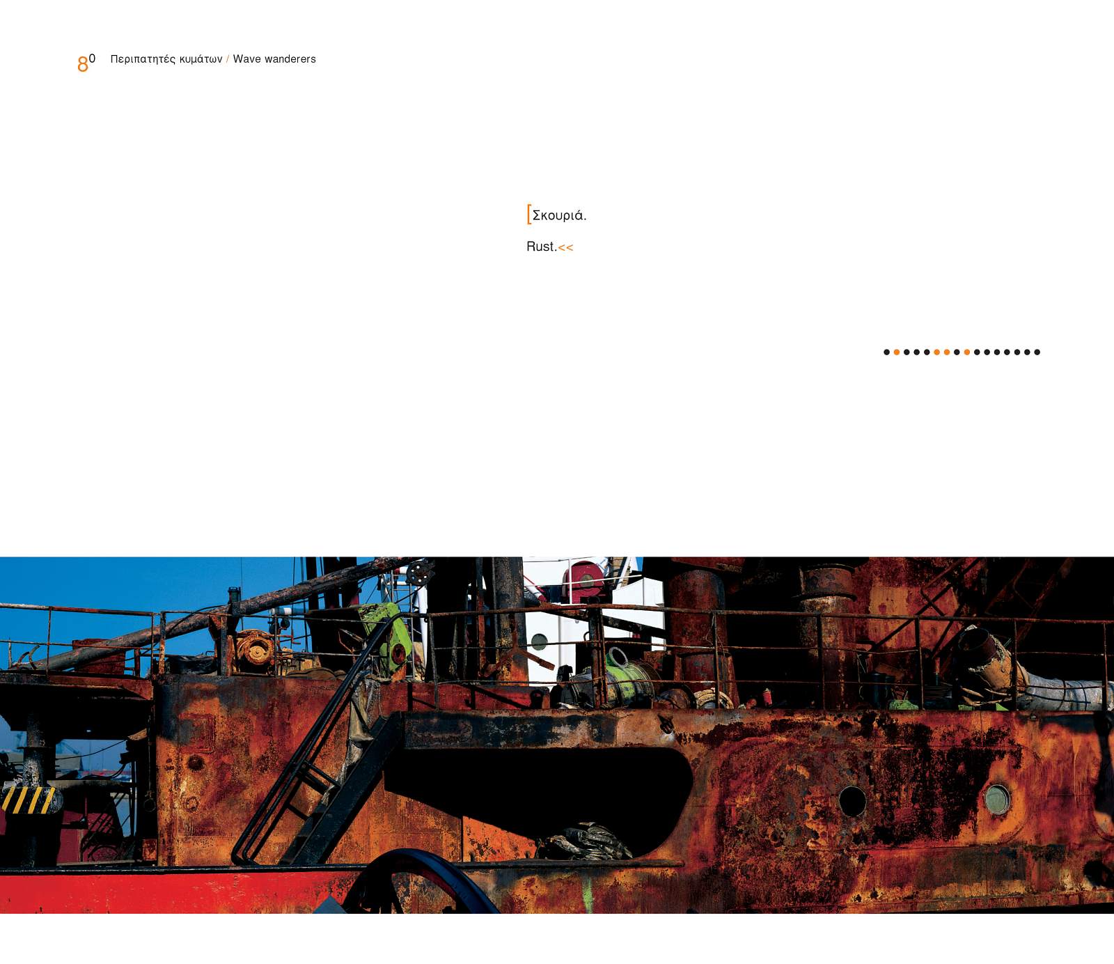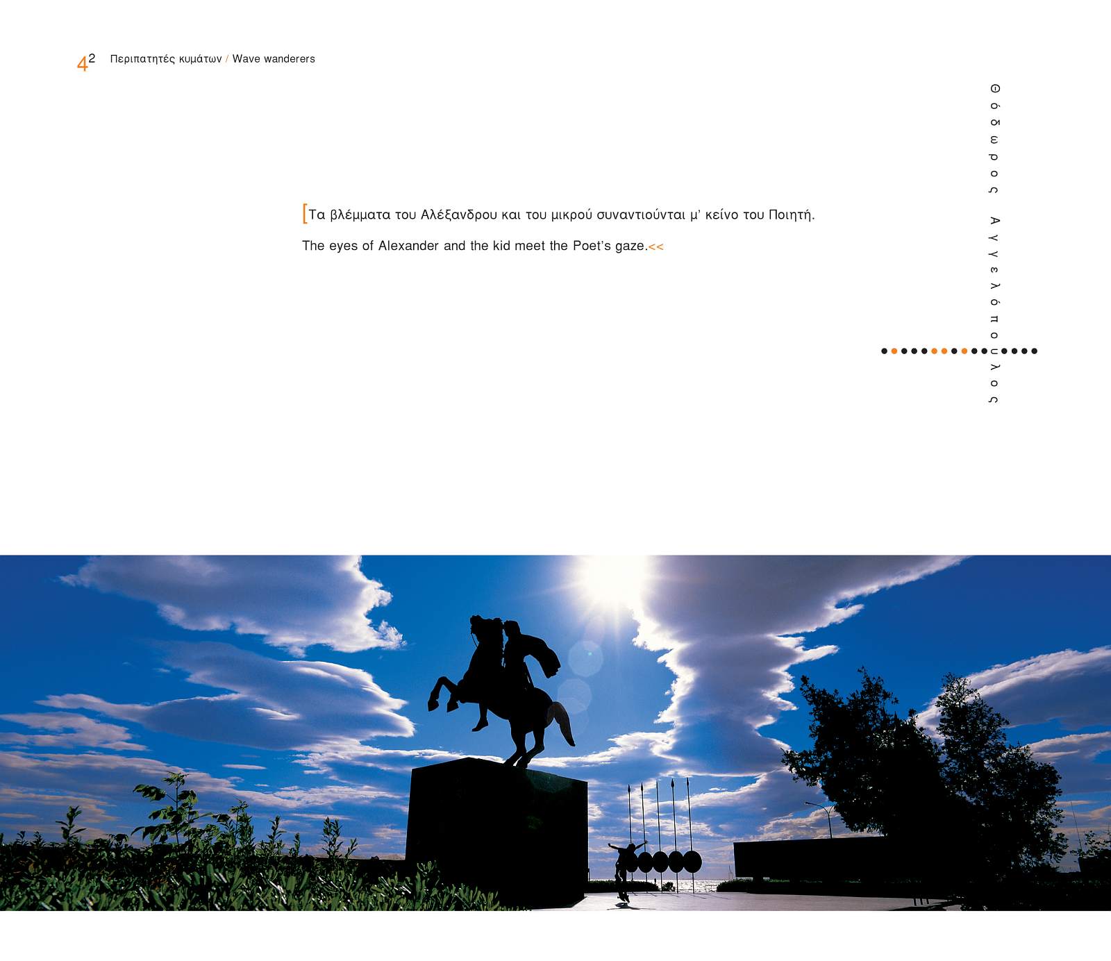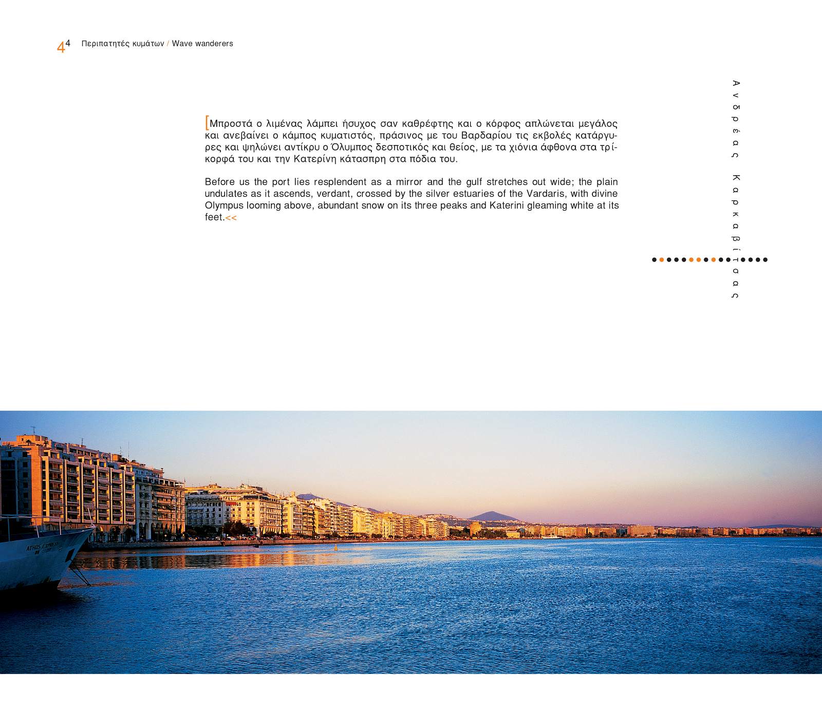 Thessaloniki awakes and is lulled to sleep to the rhythm of the sea. People, ships, seagulls, even the pelicans which pass through in wintertime – these are the voyagers who float over the waves of the Thermaic Gulf. Ten years and more of morning coffee and afternoon walks – these are the shadows of this book. “The city, is its sea, its angels walking up and down the strand or standing on its boats guardians at the gates of the Thermaikos gulf, true wave wanderers.”